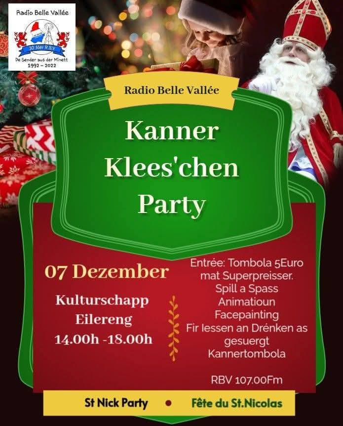 📻 Radio Belle Vallée invitéiert iech all de 7. Dezember vu 14:00 bis 18:00 Auer op Ehlereng, fir zesumme mam Kleeschen ze feieren! 🎁🎶